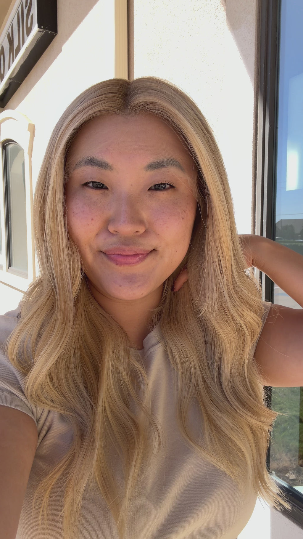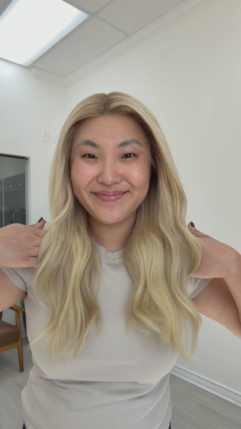 Color: Warm dimensional blonde with lighter brunette roots